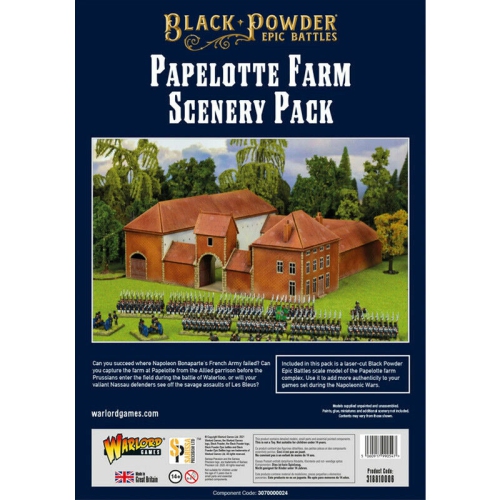 Epic Battles: Waterloo - Papelotte Farm Scenery PackProduct Description:Can you succeed where Napoleon Bonaparte's French Army failed? Can you capture the farm at Papelotte from the Allied garrison before the Prussians enter the field during the battle of Waterloo, or will your valiant Nassau defenders see off the savage assaults of Les Ble...