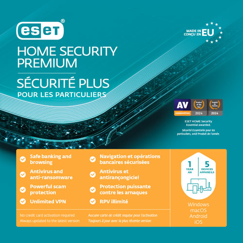 ESET Home Security Premium proactively protects PCs and Macs with multilayered security, blocking phishing and malware while encrypting sensitive data. Manage device security easily with the ESET Home platform. Browse and bank privately, shield folders, and connect securely via VPN—accessing servers in 40 countries.