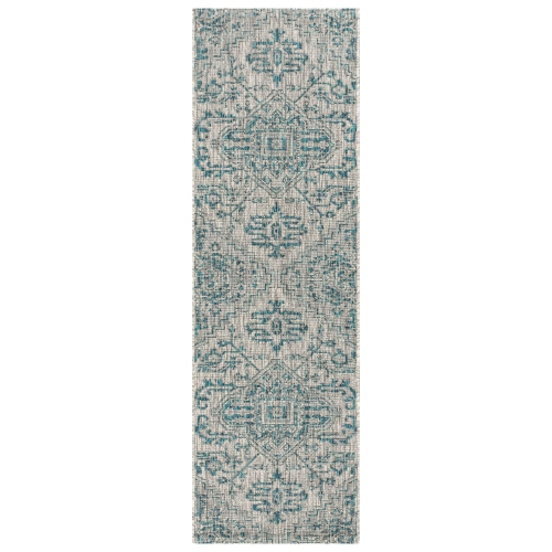 With its star-inspired medallion, this borderless rug adds dreamy Bohemian style to an outdoor porch or patio. Varied tones of teal and blue on a mingled gray background give this rug a hand-woven, vintage vibe.