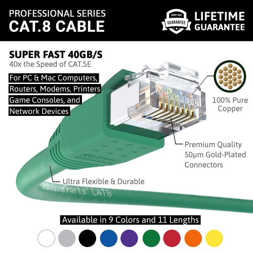 Ethernet Cable CAT8 Cable 7 FT - Green - Professional Series - 40Gigabit/Sec Network/High Speed Internet Cable for Router, Modem,Gaming/2000 MHZ, 24AWG