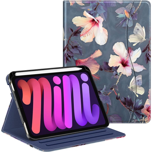 F Folio Case for iPad Mini 6 2021, Multi-Angle Smart Stand Cover with Pencil Holder & Pocket, Auto Sleep/Wake for iPad Mini 6th Generation 8.3 Inch (Blooming Hibiscus)
