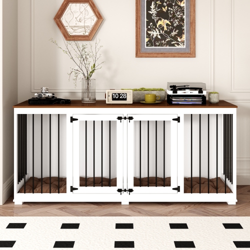 Bring functionality and style into your home with this large double-door dog crate cabinet. Featuring ample space for your pets, a durable tabletop, and a modern white and wood finish, this crate cabinet offers a perfect blend of elegance and practicality.