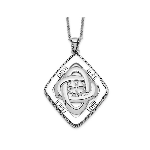 This beautiful pendant in a diamond square formation is composed of sleek sterling silver and fatures a blessing on eac side. Faith, Hope, Peace and Love are blessing included. The special pendant hangs from an 18 inch silver chain included and weighs 6.10 grams.