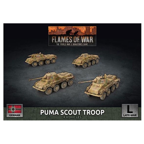 Puma Scout Troop (Plastic)Contains 4x Puma (5cm), or Sd Kfz 234 (2cm), or Sd Kfz 234 (7.5cm) Armoured Cars, 1x Decal Sheet and 3x Unit Cards.