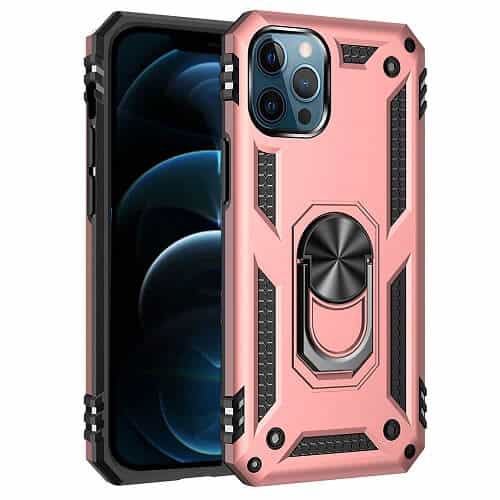 For Apple iPhone 12 Pro Max Rose Gold Military Grade 360 Degree Rotating Metal Magnetic Ring Car Mount Holder Kickstand Shockproof Heavy Duty Cover