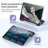 The tri-fold case doubles as a horizontal stand for hands-free viewing or typing. The auto sleep/wake feature activates when the case is opened/closed. The dual-stand design provides optimal viewing angles (e.g., streaming or typing).