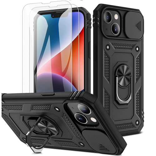 for iPhone 15 Case with Tempered Glass Screen Protector 2PCS, 360 Full Body Military-Grade Drop Protection Heavy Duty Protective Phone Cases with Ring Kickstand Bumper Case