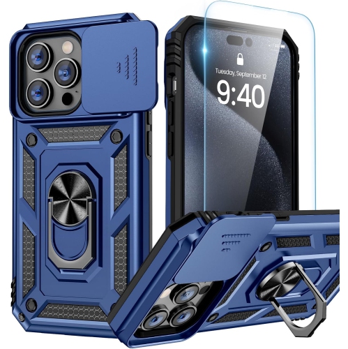 for iPhone 15 Pro Case with Screen Protector - Slide Camera Cover Protective Phone Case with Ring Stand, Heavy
