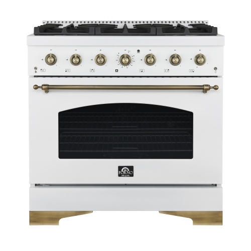 Forno Antico 36-Inch Freestanding Gas Range, White, Antique Brass Design, 6 Burners, Convection Oven, Energy Efficient