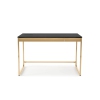 Sheer sophistication radiates from this black and polished copper-plated metal writing desk. This modern update will inspire your work to higher levels of production with its modern built-in USB ports and electrical outlets, which help to maintain a clean, precise aesthetic. A sleek design, the desk's U-shaped legs create a sturdy steel frame. Two hidden drawers, one of which has a divider for organizing, open on smooth ball-bearing glides for optimal performance.<...