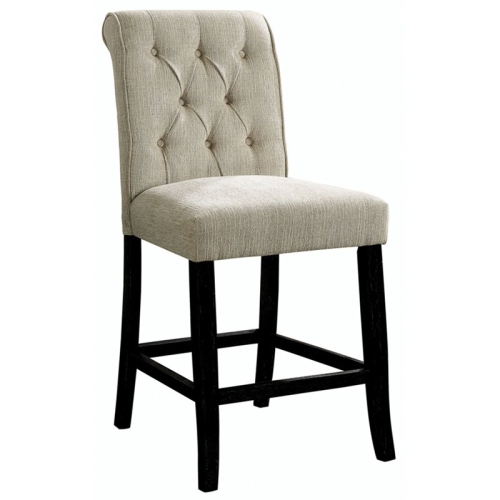 This wood pub chair features an elegant scrolled design with luxurious, button-tufted fabric upholstery and an ivory finish. Seat guests on the spacious, foam-filled seats while the sturdy tapered legs provide a solid foundation. The frames are crafted of solid wood and wood veneer for lasting quality and ample support.Features : Includes: Two (2) Pub ChairsStyle: TransitionalFinish: Ivory, Antique BlackMaterials: Sol...