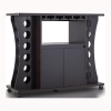 This modern mobile buffet with a wine rack exudes an abundance of charm, blending style and functionality seamlessly. Its striking deep espresso wood finish makes a bold statement in any entertaining space. The curved silhouette and linear accents are beautifully integrated, with wine storage holes on each end, a stemware rack, and a lower covered cabinet to keep everything within easy reach. The caster wheels allow for easy mobility, making this wine rack an ideal opt...