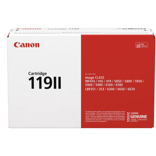 Cover your bases by stocking up on Canon 119II toner cartridges.This toner cartridge was designed and manufactured to handle all types of printing tasks.Experience quality imaging when you print with a Canon cartridge.
