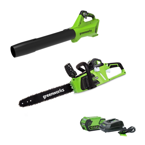 Greenworks 40V 14" Chainsaw & 40V 125 MPH - 450 CFM Axial Jet Blower Combo, 4.0Ah Battery and Charger Included