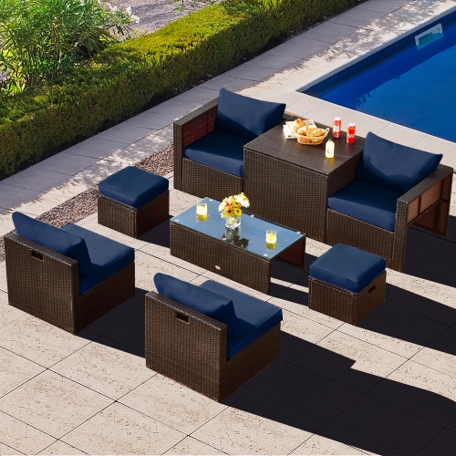 Designed with 4 sofas,2 ottomans,a storage box,and a coffee table,suitable for outdoor eating,reading,sunbathing