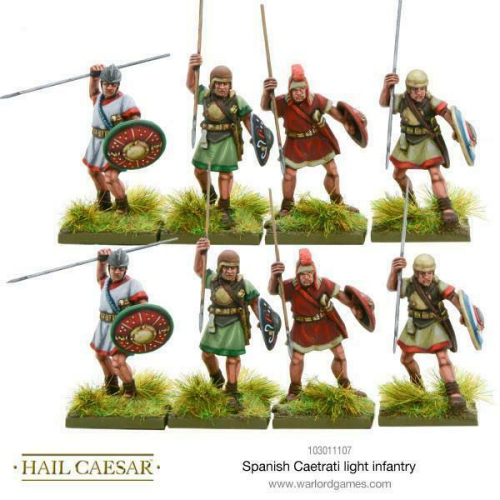 Hail Caesar Spanish Caetrati Light InfantryThe caetra, describes the small round shield of the skirmisher as opposed to the heavier and longer scutum of the main battle line warriors. In truth, however, the difference wasn't so defined. The Spanish excelled in guerilla tactics, using the difficult terrain of their homeland to good effec...
