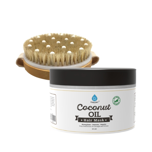 Hair Care and Massage Bundle: Bath Brush and Rubber Massager with Lotus wooden handle + 100% Natural Coconut Oil Hair Mask 10 Oz