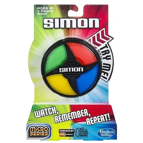 Go mobile with the Simon Micro Series game! This compact version of the classic Simon game is just like the game you already know. Watch the lights and remember how they go so you can repeat