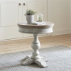 Accent your space with the Heartland round pedestal chair side table. Crafted of rubberwood solids with cathedral white oak veneers, this piece features an antique off white finish with a planked tobacco top, anchored by a round turned pedestal with X base. This classic chair side table would make a great addition to any traditional space.Features : Square to Round Turned LegsAntique FinishPlanked TopsDimensions: W24 ...