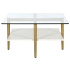This mid-century inspired coffee table is the perfect pick for your living room or den ensemble. Its base features four tapered legs connected at the center. The top is a transparent tempered glass which shows off the architectural connection and carries the rectangular design through the frame. The lower shelf is finished in lacquered white, playing off the tempered glass in size and shape.Features : Handcrafted finish is applied to the steel ...