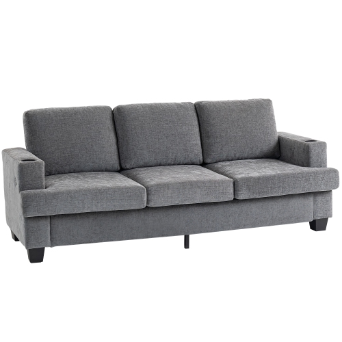 HOMCOM 3 Seater Sofa with USB Charging Ports & Cup Holders, 84" Modern Chenille-Feel Upholstered Couch with Thick Padded and Steel Frame for Living Room, Home Office, Grey