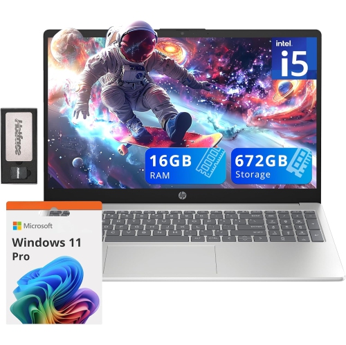HP 15.6" FHD IPS Anti-Glare Laptop, Intel i5-1235U, 16GB RAM, 672GB Storage(512GB SSD + 160GB Docking Station Set), Numeric Keypad, HD Webcam, Wi-Fi 6, Windows 11 Pro, Silver. Great for home and office use.