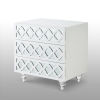 Crafted from durable MDF in a sleek lacquer finish with lucite feet, this elegant mirrored trellis piece is ideal as an end table in your living room or a night stand in your bedroom. Three gliding drawers are perfect for organizing living essentials