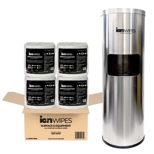 ION Wipes Gym Cleaning Starter Bundle, 3200 Wipes with Stainless Steel Floor Stand Dispenser (Silver or Black) Elevate your facility’s hygiene with the ION Wipes Starter Pack, a professional grade solution designed for gyms, studios, schools, fitness centers, and commercial buildings.