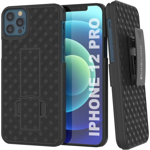iPhone 12 Pro Holster Belt Clip Case W/ Screen Protector & Built-in Kickstand | Dual Layer Hybrid TPU 360 Full