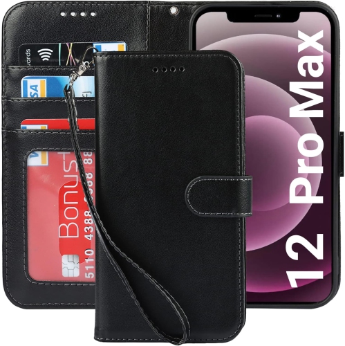 [Compatibility] -iPhone 12 Pro Max Wallet casepatible with iPhone 12 Pro Max ONLY,Not fit other mobile phones.[Material]Made of Premium Leather feels soft.Maximum protection for your phone.[Wallet Feature]This wallet case features 3 card holders,a side pocket for money or additional cards.The effective and stylish magnetic lock design secures your money and cards.The series wallet case can switched to a horizontal position and act as a firm stand.Wrist strap makes it easy