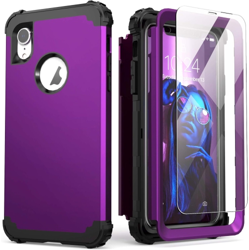 iPhone XR Case with Tempered Glass Screen Protector, 3 in 1 Shockproof Slim Hybrid Heavy Duty Hard PC Cover Soft