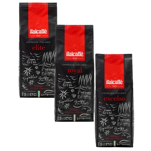 discover three Italcaffe italian espresso blends: elite (smooth and floral), royal (bold and full-bodied), and excelsO (aromatic and sweet). 3 x 1kg vacuum-sealed whole bean bags. perfect for espresso machines and grinders.