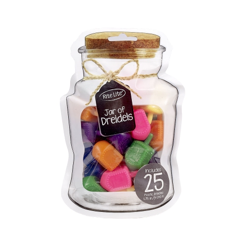 Jar of dreidels, spin the dreidel game. Includes 25 multi color medium plastic dreidels. A popular children's Hanukkah game for generations