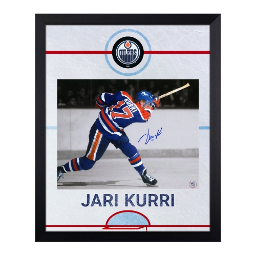 Jari Kurri Autographed Edmonton Oilers Color Isolation Graphic Rink 19x23 FrameThe 11x14 photo in this frame is hand-signed by Jari Kurri.AJ Sports frame design features a top view graphic of a hockey rink.Edmonton Oilers logo puck slice is mounted at centre ice.Jari Kurri is pictured in shooting the puck in vibrant isolated color against a black and ...