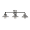 Like a classic barn light but in a modern shape and smaller scale, this classic design features a metal cone shade that conceals the top half of the bulb -- perfect for a clean, industrial look. In a matte nickel finish, this sconce is perfectly at home on either side of a bathroom mirror or as extra lighting in kitchens, where your hardware truly shines. Also available in multi-light configurations, the geometric shape adds elegant interest to any space.