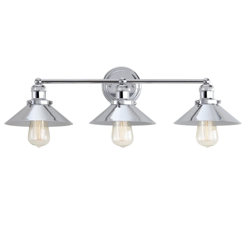 This dynamic design features a metal cone shade that conceals the top half of the bulb -- perfect for a polished industrial look. In a shiny chrome finish, this sconce is perfectly at home above a bathroom mirror or as extra lighting in kitchens, where your hardware truly shines. Also available in other single and multi-light configurations, the geometric shape adds elegant interest to any space.