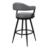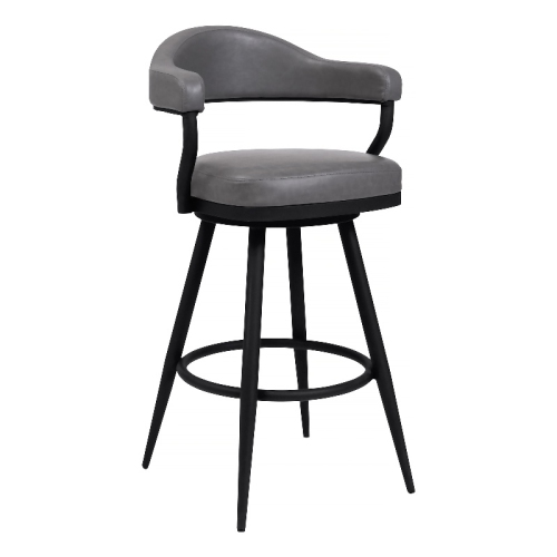 Enhance the bar seating experience for you and your guests with the Justin 30" Bar Height Swivel Vintage Grey Faux Leather Bar Stool with Black Metal Legs from Armen Living. The strong frame is constructed from metal and its cool appeal is further accented by the soft faux leather upholstery. The open back allows for easy breathable seating and makes cleanup a breeze. Engaging with your guests has never been easier thanks to the 360-degree swivel function that adds con...