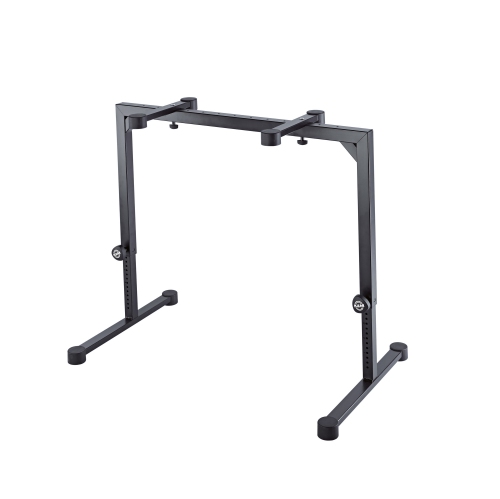 Its compact steel tubing construction and large round floor protectors make this attractive keyboard table significantly more stable. Two sided spring-loaded locking screws make precision height adjustment easy. The support arms can be adjusted to suit the size of the keyboard. When folded, the table is impressively flat. The design of the table complements keyboard bench 14085 or 14086. An