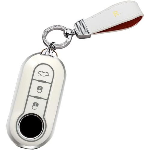 Key Fob Cover Compatible with Fiat Ducato 500 500L Panda Grande Punto Lancia Musa 3 Button Keys Car Accessories TPU Silver-Edge Smart Remote Auto Key Case with Bling Keychains-Whtie