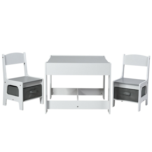 Inspire creativity and keep play areas tidy with this multi functional kids table and chairs set, featuring built-in storage boxes, a reversible tabletop with blackboard and whiteboard surfaces, and two matching chairs. Perfect for drawing, writing, crafts, and learning activities, the dual-sided tabletop flips easily to switch between a blackboard and whiteboard—offering endless opportunities for artistic expression.