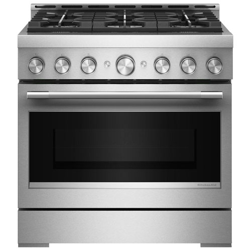 - 36-inch freestanding gas range features a contemporary design that fits seamlessly in your kitchen