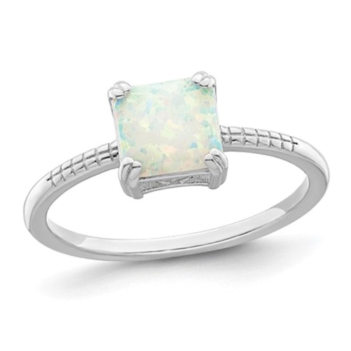 A beautiful smooth opal gemstone sits in the embrace of a sleek rhodium plated sterling silver foundation in this gemstone ring featuring the birthstone for October.