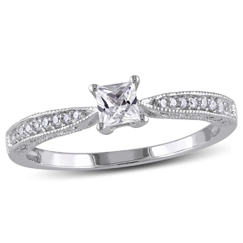 This gorgeous ring features a square-cut created white sapphire center stone that glimmers with icy round white diamond side stones. Set in lustrous sterling silver, this pretty ring is enhanced with a high polish finish.