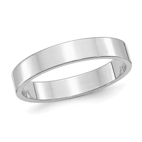 Wonderfully smooth and shiny, this flat wedding band is molded out of flowing sterling silver featuring a really sleek look. This classic flat wedding 4mm band style weighs 3.85 grams.