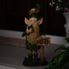 Solar powered outdoor garden gnome. Tree sign reads welcome; lighted with LED micro lights. Features intricate detailing resembling carved wood