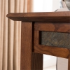 The Leick Slatestone Oak Drawer End Table's natural stone details and comfortable worn finish give this table a familiar, grounded feel on day one. Solidly built on sturdy oak posts each piece in the Slatestone Collection offers layers of storage and display assistance. Store your magazines, books and decor items on the large lower shelf and tuck your remote contols in the solid wood center drawer. Quality wood construction with a hand applied multi step Rustic Oak fin...