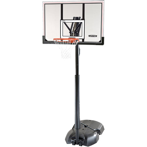 Bring basketball fun home with the Lifetime Front Court 50" portable basketball system. Simply move this heavy-duty hoop to your desired location, then fill the base with sand or water to keep it securely in place while you play. It's equipped with a shatterproof backboard, Slam-It rim, and a height-adjustable pole for customized practice setups.