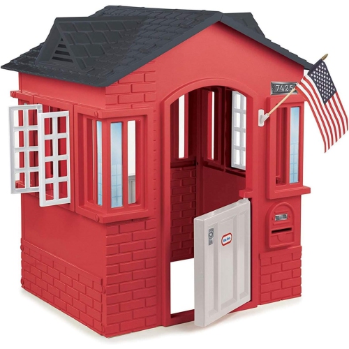 A lightweight, contemporary playhouse for toddlers that resembles a real house, perfect for pretend play. It features 2 working doors, 2 windows with shutters, mail slots, and flag holders. Easy to move and relocate.