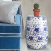 Our drum-shaped ceramic Chinese garden stool is decorated in a banded design with Lotus flowers. Timelessly chic, blue and white Chinoiserie garden seats are loved by Maximalists and Hollywood Regency fans alike.