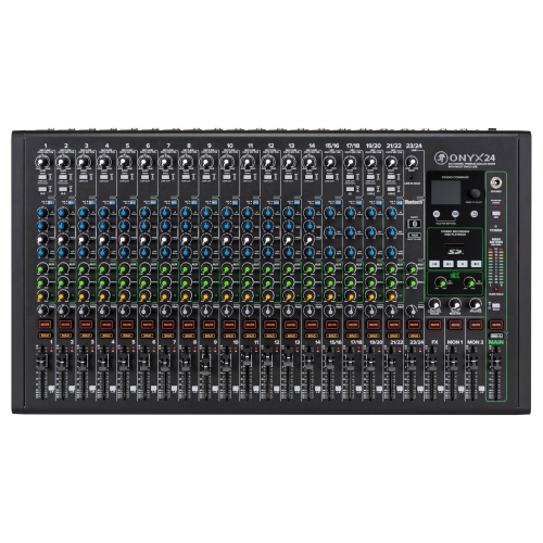 The Mackie Onyx24 24-Channel Premium Analog Mixer with USB is the ultimate compact solution for live audio, home recording, and content creation. 24-Bit / 96kHz multitrack recording, award-winning, high-gain Onyx mic preamps, and an end-to-end ultra-low-noise design deliver the sound quality professionals demand. Packed with features including powerful DSP effects, British-style Perkins EQ, full-color display, and integrated recording and playback from an SD card. The Onyx16 Premium Analog Mixer gives you the power you need to capture your best performance with pristine fidelity at home or on the go.